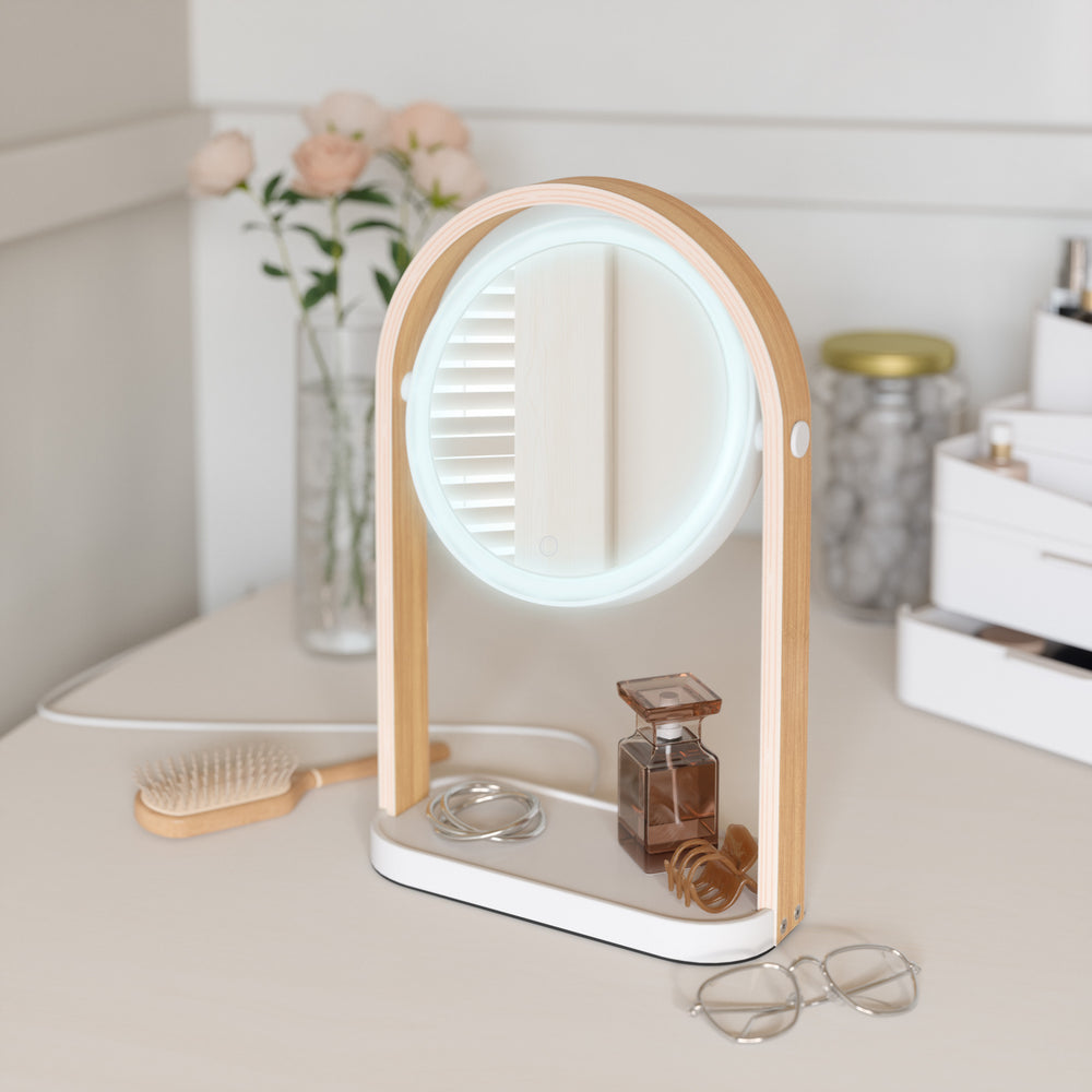 El espejo de tocador Bellwood combina un estilo moderno con la funcionalidad cotidiana, aportando curvas suaves y características bien pensadas. Una luz LED continua rodea el perímetro del espejo, proporcionando una iluminación uniforme y sin sombras para maquillarse, arreglarse y mucho más. Una bandeja integrada mantiene los elementos esenciales al alcance de la mano, mientras que su fuente de alimentación USB-C incluida garantiza un uso fiable sin necesidad de baterías. Cambie fácilmente entre tres temperaturas de luz (2700K), blanco natural (4000K) y blanco frío (6500K) con un sensor táctil simple en la superficie del espejo. Mantenga presionado el sensor táctil para ajustar la intensidad. El espejo de doble cara gira para mostrar un aumento de 10x en el lado opuesto. Medidas: 38 cm x 25 cm x 12 cm (15" x 9.8" x 4.5").